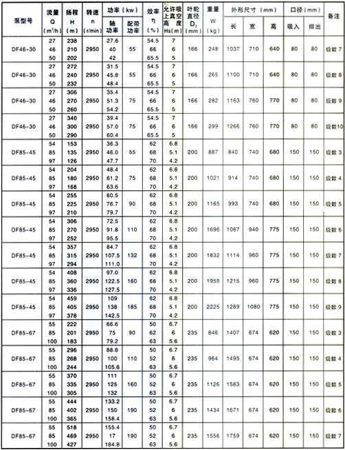 DF型泵供輸送溫度為-20~105℃,不含固體顆粒、有腐蝕性的液體。泵的進(jìn)口壓力小于0.6MPa。DF型泵是臥式、單吸、多級多段式離心泵,泵的出口入口均垂直向上,用拉緊螺栓將泵的吸入段、中段、吐出段聯(lián)結(jié)成一體,泵轉(zhuǎn)子由裝在軸子的葉輪、平衡盤等零件組成。轉(zhuǎn)子兩端由滾動軸承或滑動軸承支撐,滾動軸承用油脂潤滑,轉(zhuǎn)子軸向力由平衡盤平衡。